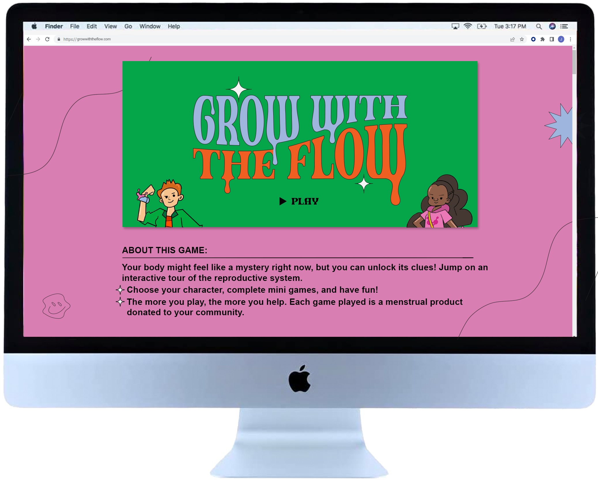 A video game that teaches pre-teens and their parents about the reproductive system. Since kids are not learning about their bodies in schools, we chose to meet them where they are—online.